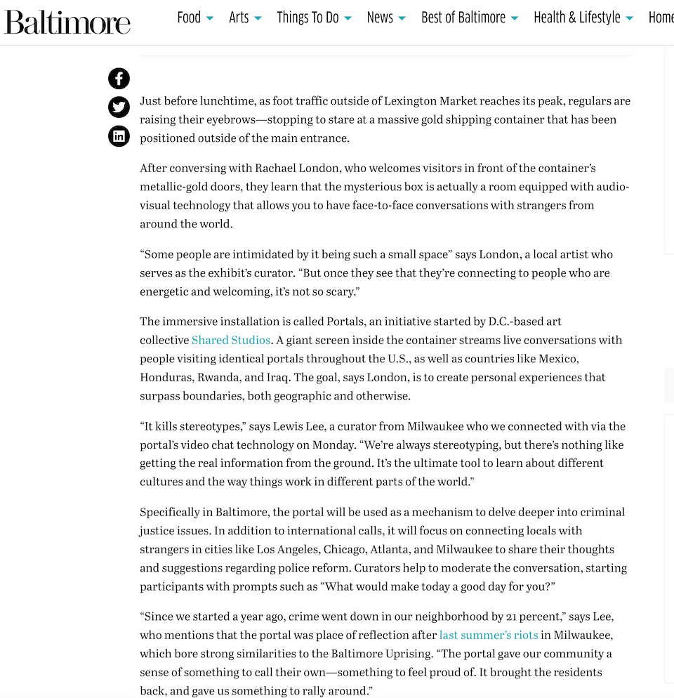 As the sole curator and operator in Baltimore for international art, social research and tech initiative, Shared Studios, I managed my curatorial duties and public presence while building relationships with local and international partners, such as the Baltimore Development Corporation and the Downtown Partnership, and creating programming for Baltimore’s Light City festival.