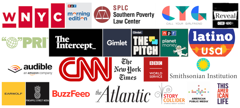 This American Life, WNYC (On The Media, Studio 360, Takeaway, Trump Inc, and others) Planet Money, Audible, Reveal, CNN, The Center for Investigative Reporting, Latino USA, KQED, The Atlantic, Make/TimeWord of Mouth (New Hampshire Public Radio), ABC Australia, CBC, Great Jones Production, Pineapple Street Media, New York Times, The Intercept, ABC Radio, The Guardian, fivethirtyeight, Smithsonian Museum Digital Media, Story Collider, Life of the Law, BuzzFeed Media, BuzzFeed News, No One Knows Any-thing, American Public Media, EarWolf, Gimlet (including The Pitch), Pacific Content, BBC’s World Service, HowStuffWorks, Georgia Public Broadcasting, Transmitter and many others.